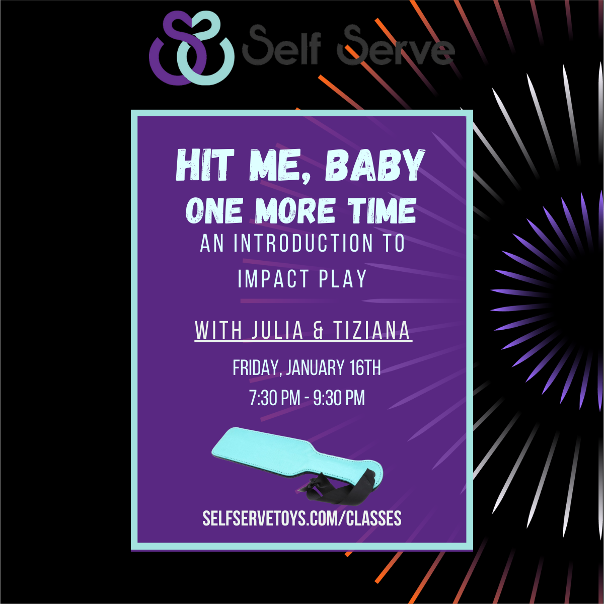 If you’ve ever been curious about spanking, flogging, and other forms of impact play, this is the class for you! We will give you all the tools you need to run or participate in a scene with confidence including safety, communication, skills, and aftercare. We will also talk about different hitting implements and how to use them, power dynamics and exchange, negotiating a scene, and how to hit and be hit. This class will include live demonstrations and an opportunity to hit/be hit with supervision. If you’ve wanted to step up your kinky experiences from a few spanks here and there to a full-blown impact scene, join us for this hour-and-a-half intensive. Bring your hitting implements (if you have them), your questions, and your excitement!